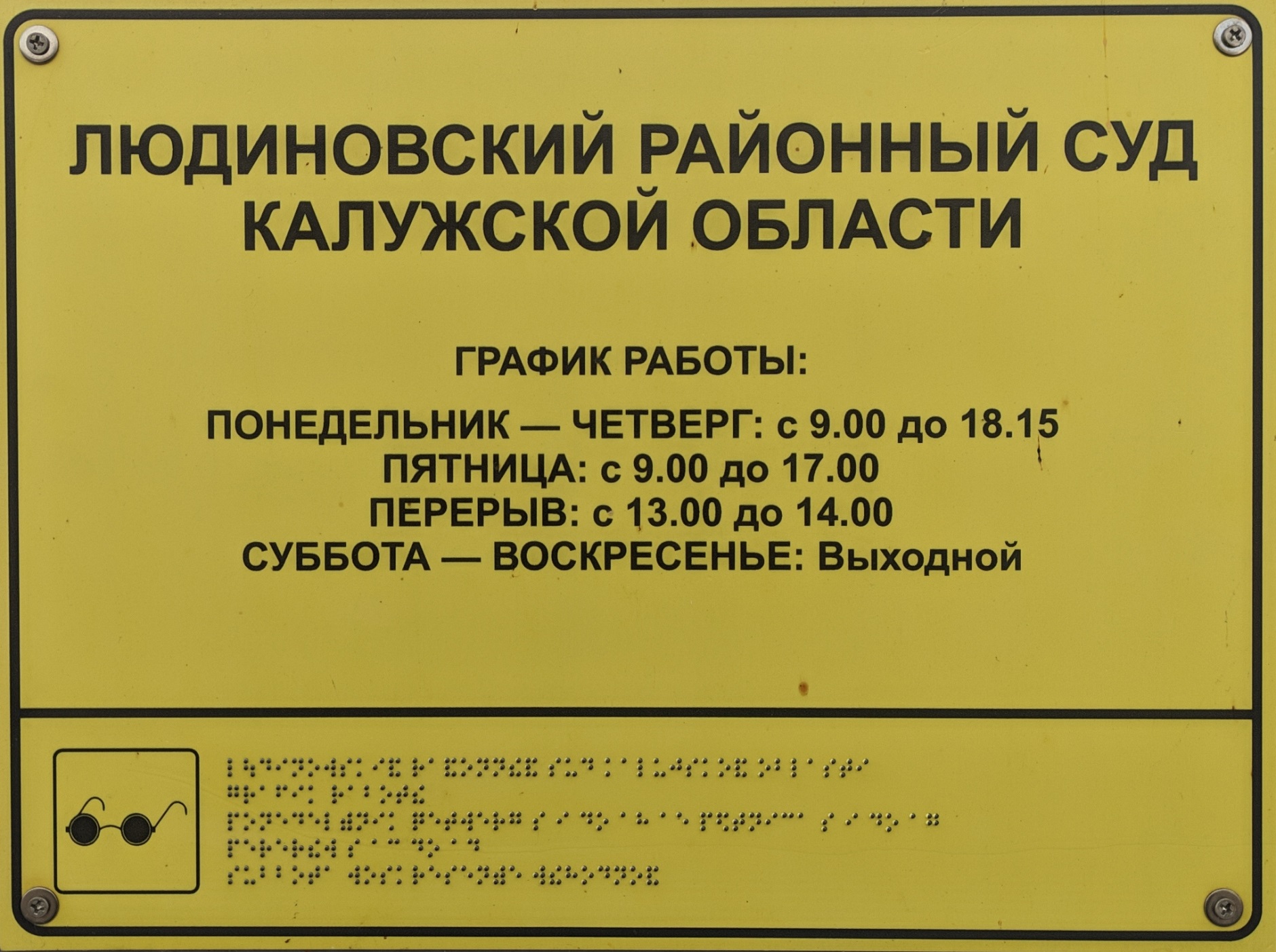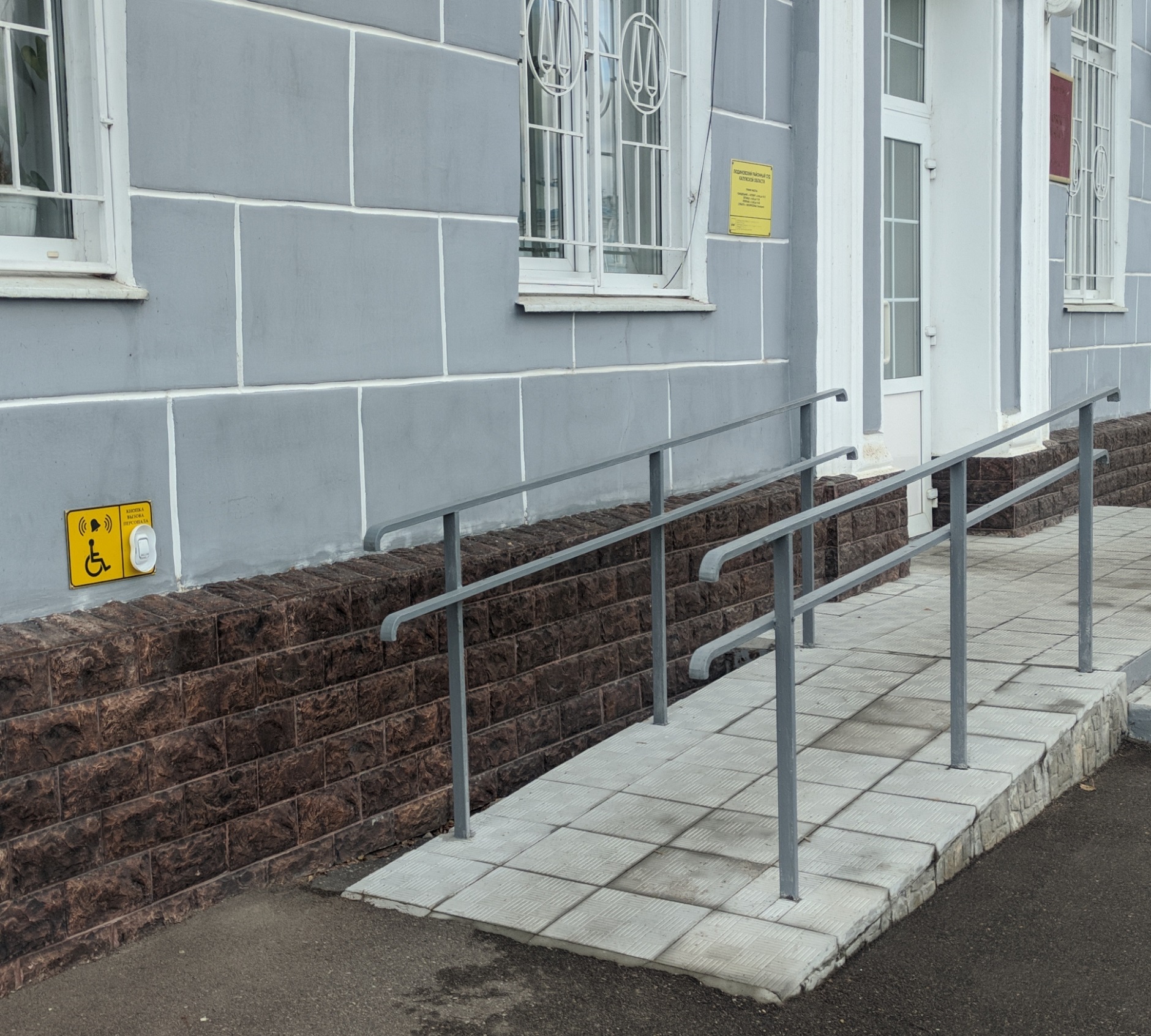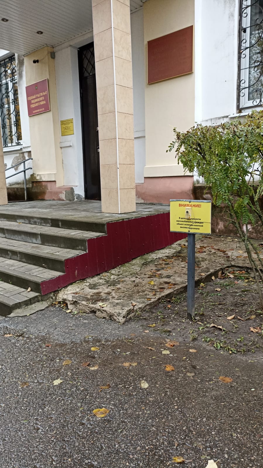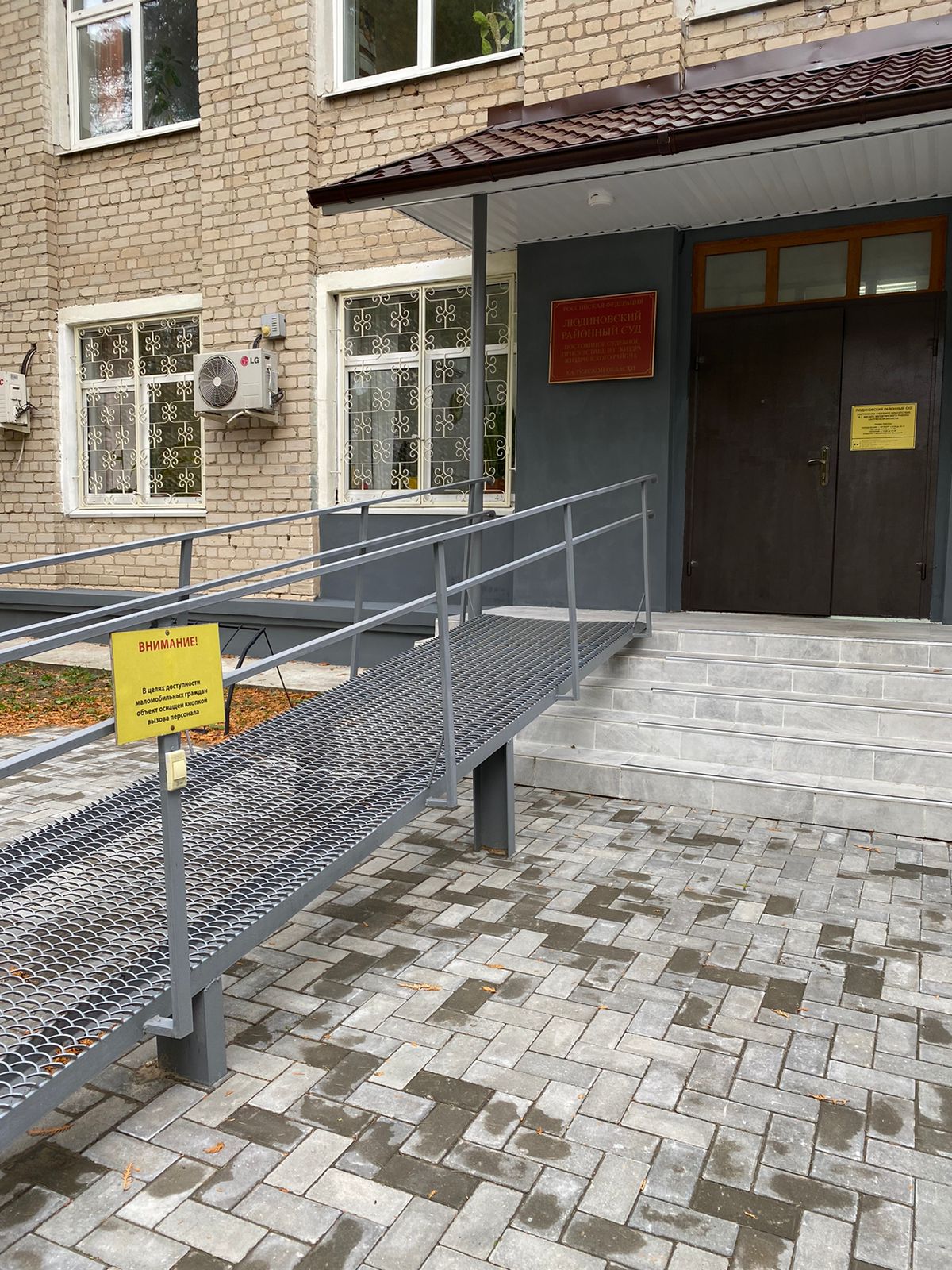 В соответствии с Федеральным законом от 24 ноября 1995 года № 181-ФЗ «О социальной защите инвалидов в Российской Федерации», приказом Минстроя России от 30 декабря 2020 года N 904/пр об утверждении СП 59.13330.2020 "СНИП 35-01-2001 Доступность зданий и сооружений для маломобильных групп населения", Приказом Судебного департамента при Верховном Суде Российской Федерации от 31 декабря 2015 года №406 «Об утверждении Порядка обеспечения условий доступности для инвалидов объектов федеральных судов общей юрисдикции, федеральных арбитражных судов и органов Судебного департамента при Верховном Суде Российской Федерации», Правилами пропускного режима и пребывания посетителей в судах и иными нормативно-правовыми актами Российской Федерации, регулирующими вопросы организации условий доступа инвалидов и других маломобильных групп населения, принимаются меры по улучшению качества условий доступности и пребывания инвалидов и маломобильных групп населения в здания Людиновского районного суда Калужской области. Для беспрепятственного доступа в здания суда инвалидов - колясочников организован вход с пандусом и кнопкой для вызова персонала. После получения сигнала, судебный пристав по ОУПДС встретит инвалида-колясочника, установит личность инвалида и сопровождающего, поможет кратчайшим путем добраться до места целевого посещения. Установлена тактильная табличка, выполненная рельефно-точечным шрифтом Брайля. | |